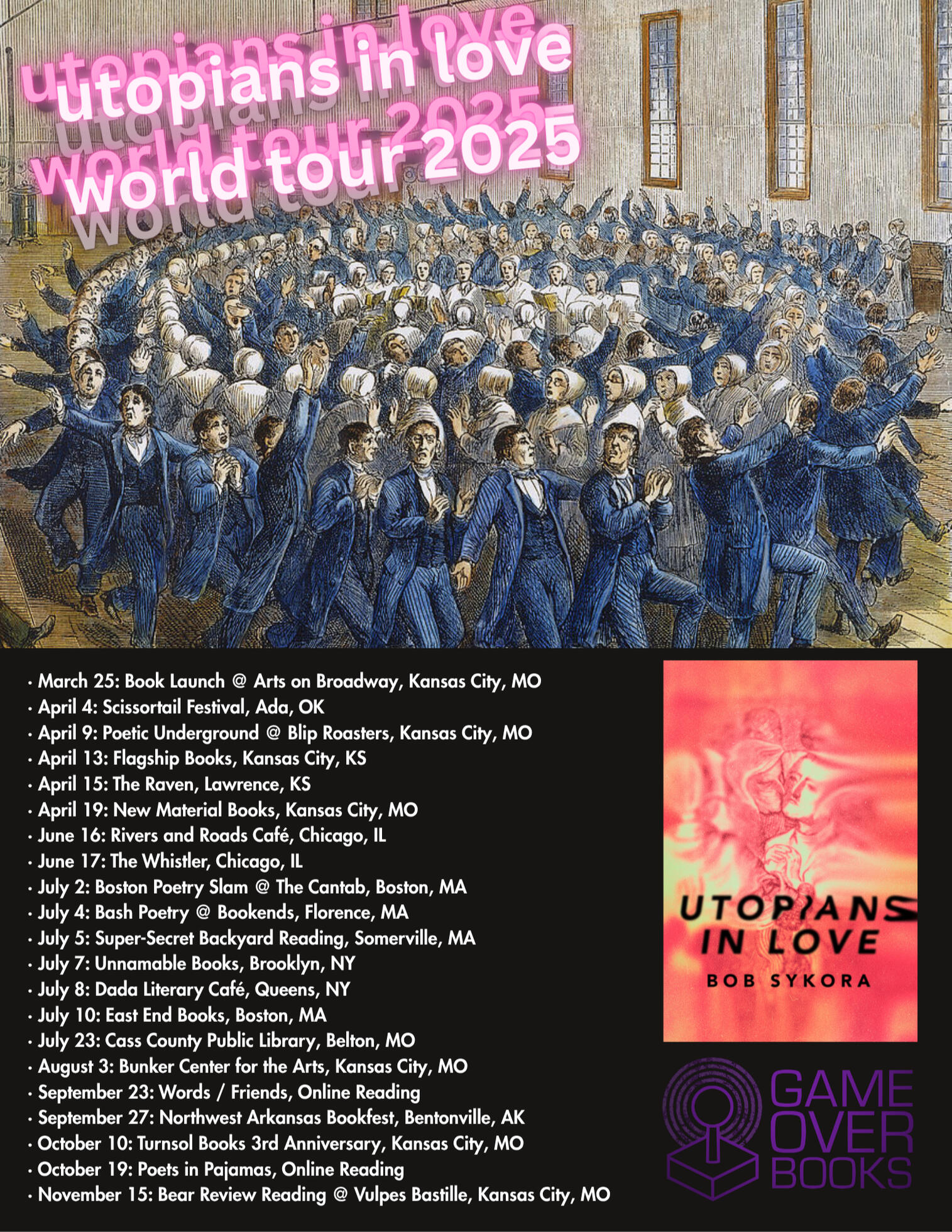 Bob Sykora is the author of the collection Utopians in Love (Game Over Books 2025) and the chapbook I Was Talking About Love–You Are Talking About Geography (Nostrovia! 2016). He lives in Kansas City, where he teaches at community college, edits with Garden Party Collective, co-hosts The Line Break podcast, and curates the KC Poetry Calendar.
